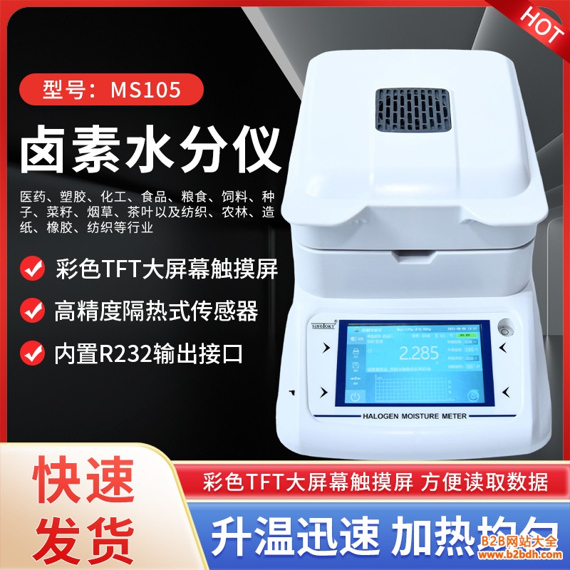 MS105卤素水分仪采用彩色 TFT大屏幕触摸屏,可广泛应用于一众需要快速测定水分的行业,如医药、塑胶、化工、食品(鱼糜、脱水蔬菜、肉类和水产加工、面条、面粉、饼干、月饼等)、粮食、饲料、种子、菜籽、烟草、茶叶以及纺织、农林、造纸、橡胶、纺织等行业中的生产过与实验过程中。卤素水分测定仪MS105特性