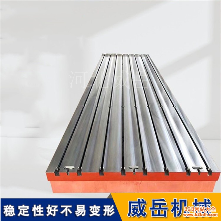 铸铁T型槽平台精度平板制成筋板式和箱体式,工作面有长方形、正方形或圆形。工作面采用刮削工艺,工作面上可加工V形、T形、U形槽和圆孔、长孔等。铸铁检验平板、铸铁划线平板、铸铁铆焊平板、铸铁装配平板、动力机械震动试验台(又称槽铁或地梁、地轨)、铸铁方箱、检验棒、V型铁、花岗石平板(石平板)以及其他石量具划线平台、铆焊平台、试验平台、装配平台、检验平台、大理石平台、铸铁工作平台组合拼装T型槽平板、铁地板,检验、划线装配、铆焊、工装用平板,镗铣床平台,三座标仪平板,模具垫板,实验室基础平板,槽铁(地轨)、方(垫)箱机床工作台、震动实验台、基础平台、落地工作平台、检测平台、划线平台、装配平台、铆焊平台、组合平台材质为强度(HT200~300). 工作面硬度HB170~240.经过两次时效处理(人工时效及自然时效2~3年).使该产品的精度稳定而抗磨性好.精度按国家标准计量检定规定规程执行.平台 (按GB4986-85制造)划线、检验、测量、铆焊、装配、焊接用工作平台 工作面精度一般为1级。