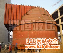 9)当整个气柜柜顶系统上升到指定的安装位置时,可以进行柜顶的安装工作,柜顶安装完哔可将挂钩装置与柜顶脱离,使挂钩装置随同活塞系统整体回落。